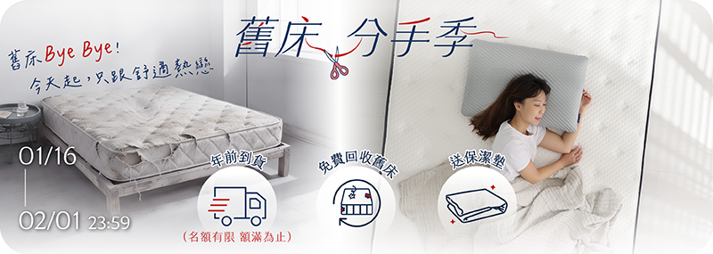 至2026-02-01T16:00:00.000+00:00截止 指定商品,【 舊床分手季 💔】凡購買獨立筒床墊,即贈『舊床免費回收服務』(同配送地點、同購買數量)